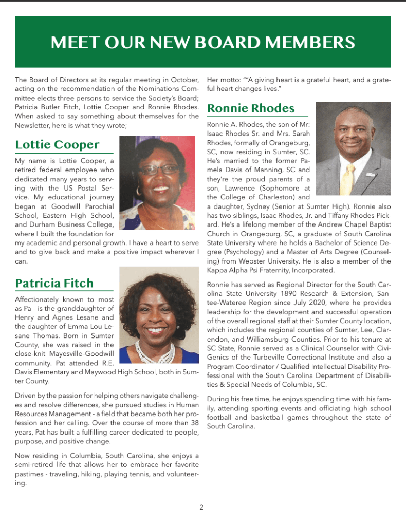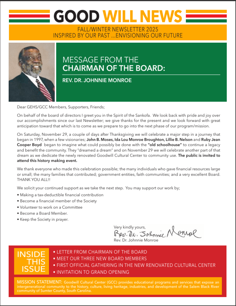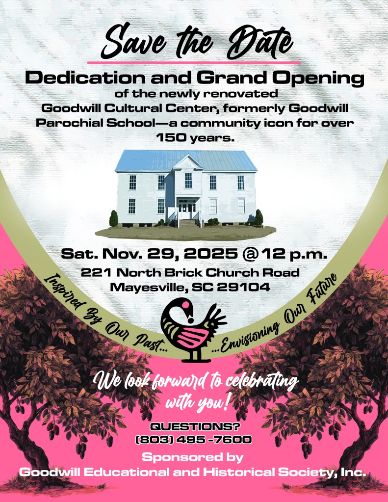 The school was sponsored and supported by the Presbyterian Church in the U.S.A. for over sixty years and then by Goodwill Presbyterian Church, which stands nearby. In 1867, two years after the 13th Amendment of the Constitution of the United States was ratified, ending slavery, 100 black members of Salem-Black River (Brick) Presbyterian Church requested leave from the church they had attended as slaves to establish their own church. This request was granted and with the help of Reverend Jonathan Clarkston Gibbs, a white missionary, the black members were allowed to leave in “goodwill” and begin the construction of their church. The congregation walked two miles down Brick Church Road to where Hamilton Gaillard Witherspoon, the owner of Coldstream Plantation, had given them a two-acre tract in 1868 near the present Dabbs’ Crossroads section of Sumter County. On this land the members built a second sanctuary — Goodwill Presbyterian Church, the first black Presbyterian Church in the Sumter community.